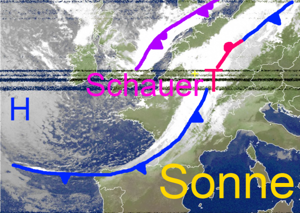 Hinter der Kaltfront des kleinen Randtiefs über Süddeutschland strömt hochreichende Polarluft nach Mitteleuropa, in der sich bei Temperaturen von nur noch 10 bis 17 Grad immer wieder Regengüsse und einzelne Gewitter bilden können. Die Front brachte dem Südwesten von gestern auf heute gebietsweise über 50 Liter Regen pro Quadratmeter. Vor der Front kletterten die Temperaturen im Warmsektorbereich von Süddeutschland zum Teil über 20 Grad.