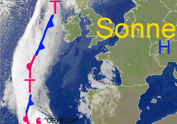 Während über weiten Teilen Mitteleuropas, sowie über der Mittelmeerregion Bilderbuchwetter mit spätsommerlichen Temperaturen vorherrscht, brodelt es über dem östlichen Atlantik. Hurrikan "OPHELIA" wirbelt heran. Er wird morgen unter einem sich noch verstärkenden Tiefdruckgebiet Irland erreichen und vermutlich für erhebliche Schäden sorgen. Auf Dienstag rauscht er als Orkantief über Schottland hinweg und wird sich auf seinem weiteren Weg bis nach Südnorwegen deutlich abschwächen.