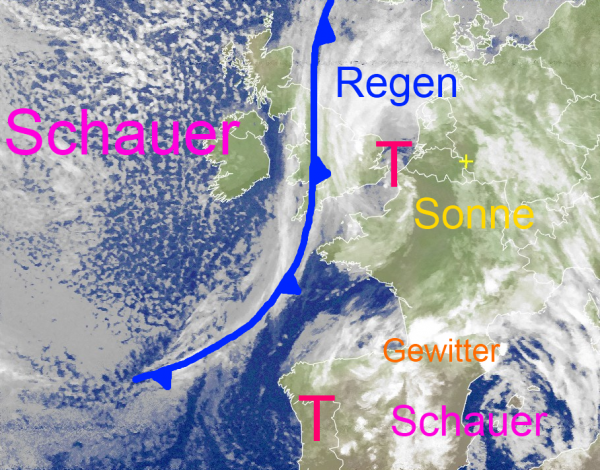 Das Tief über Portugal sorgt in Südwesteuropa für teils kräftige Schauer und Gewitter. Möglicherweise könnte es in der Nacht auch mal bei uns blitzen und donnern.