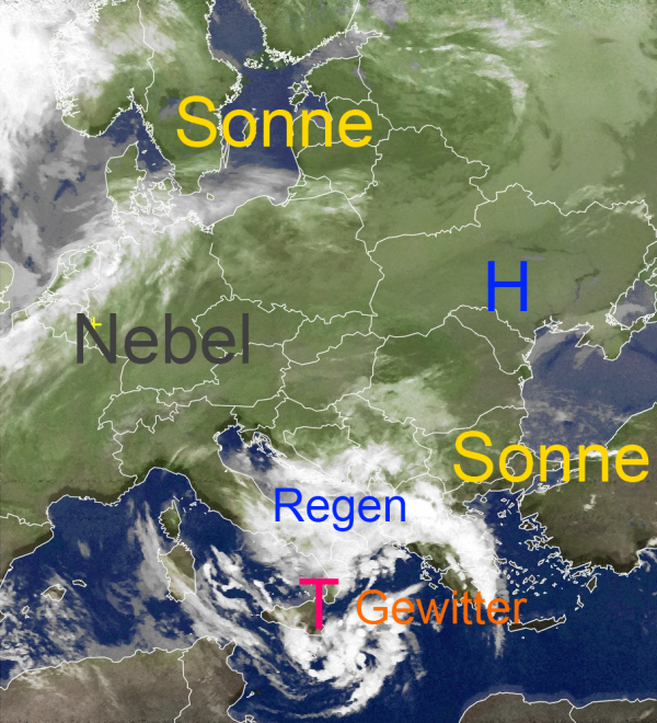 Ruhiges Herbstwetter findet man dagegen über weiten Teilen Mitteleuropas. Allerdings hält sich vielfach zäher Nebel oder hochnebelartige Bewölkung, die kaum Sonnenstrahlen durchlässt.