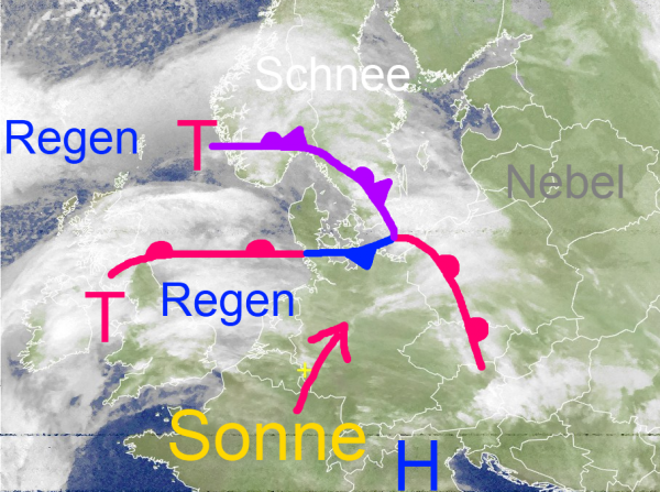 Hinter der nach Polen abgezogenen Warmfront ist spürbar mildere Luft nach Deutschland geströmt. Gleichzeitig wurde es von Südwesten immer freundlicher und sonniger. Die Temperaturen kletterten zum Teil schon auf über 15 Grad. Nur im Norden dominierten noch dichte Schichtwolken mit Regen und Sprühregen.