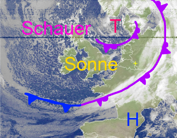 Auf der Rückseite des Tiefs bei Dänemark, strömt kalte Polarluft nach Süden. Weil das Festland derzeit kälter ist als das Wasser des Ozeans hat sich über den Britischen-Inseln ein Sonnenfenster gebildet. Über dem Meer hingegen erkennt man zahlreiche wabenförmige Schauerwolken.