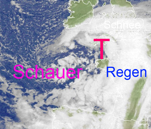 Der Wolkenwirbel des Tiefs bei den Britischen-Inseln brachte vor allem dem Südwesten Regen. Auf seiner Rückseite zapft er die Polarluft an, die in der Nacht und morgen örtlich für Schnee- oder Schneeregenschauern sorgt. Im Tagesvlerauf lässt sich gebietsweise aber auch mal die Sonne blicken.