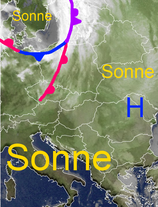 Freundliches Wetter mit reichlich Sonnenschein herrschte heute auch über Italien, dem Balkan und Teilen Osteuropas. Auch über Südschweden tat sich auf der Rückseite der Fronten ein sonniges Fenster auf.