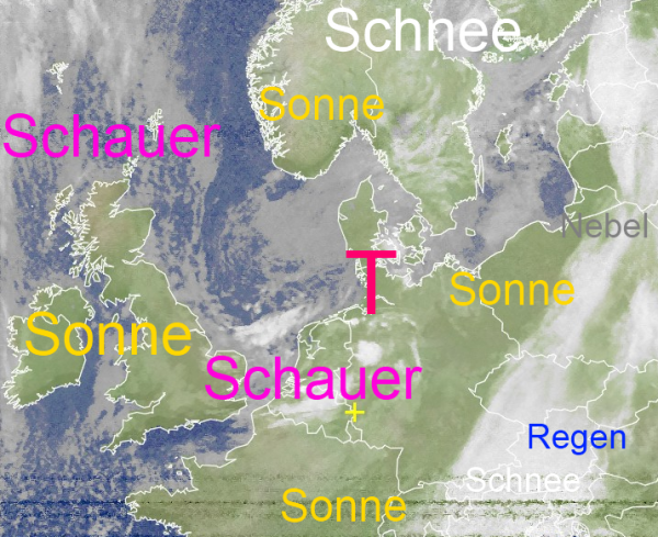 Das Tief über Schleswig-Holstein sorgt in weiten Teilen Europas für wechselhaftes Wetter. Dabei findet man freundliche Plätze mit Sonnenschein, aber auch gebietsweise dichte Wolken mit Niederschlägen oder Schauern. In höheren Lagen fällt oft schon Schnee, in den Niederungen meist noch Regen oder Schneeregen. Ab Sonntag erreicht uns kältere Luft aus Skandinavien, so dass es auch in tiefen Lagen zu einigen Schneefällen kommen wird.