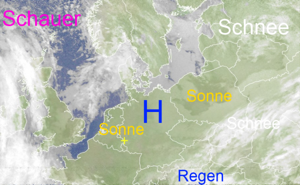 Die Schneewolken über Süddeutschland sind abgezogen. Jetzt hat sich ein Hochdruckgebiet aufgebaut. Wegen des schwachen Windes halten sich die Wolken jedoch teilweise zäh. Vor allem in der Nordwesthälfte unseres Landes ist es aber überwiegend freundlich mit reichlich Sonnenschein.