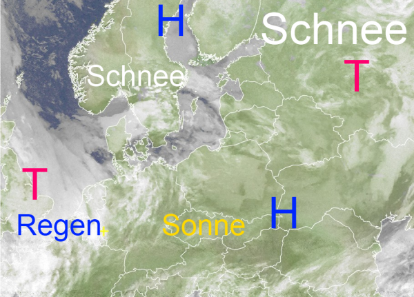 Das Tief bei den Britischen-Inseln zieht mit seinen Regen- und Schneewolken nach Frankreich. Es hat auf unser Wetter keinen nennenswerten Einfluss. Die Luft dreht in den nächsten Tagen auf Nordost. Dadurch wird immer kältere Luft aus dem Eiskeller Russlands angezapft, so dass uns am Wochenende Dauerfrost droht. Neben dichteren Wolken mit etwas Schnee, scheint zwischendurch auch gelegentlich die Sonne.