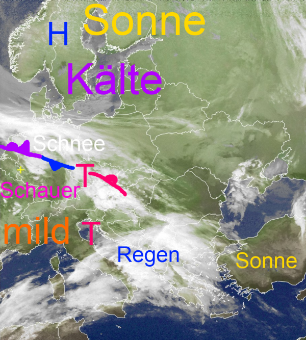 Die quer über Deutschland liegende Luftmassengrenze trennt kalte Luft im Norden, von milder Luft im Süden. Im Bereich der Zone fällt Schnee und örtlich auch gefrierender Regen. Die Luftmassengrenze kommt am Wochenende allmählich nach Süden voran.