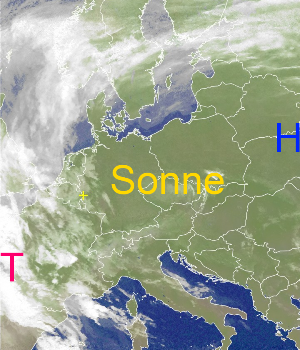 In großen Teilen Mittel- und Osteuropas dominiert freundliches und warmes Frühlingswetter mit reichlich Sonnenschein. Über Frankreich und Westeuropa machen sich jedoch schon die Wolken des Tiefs über dem Atlantik bemerkbar und sorgen teilweise für Regen und Schauer. Hohe Schleierwolken haben auch schon den Westen unseres Landes erreicht.