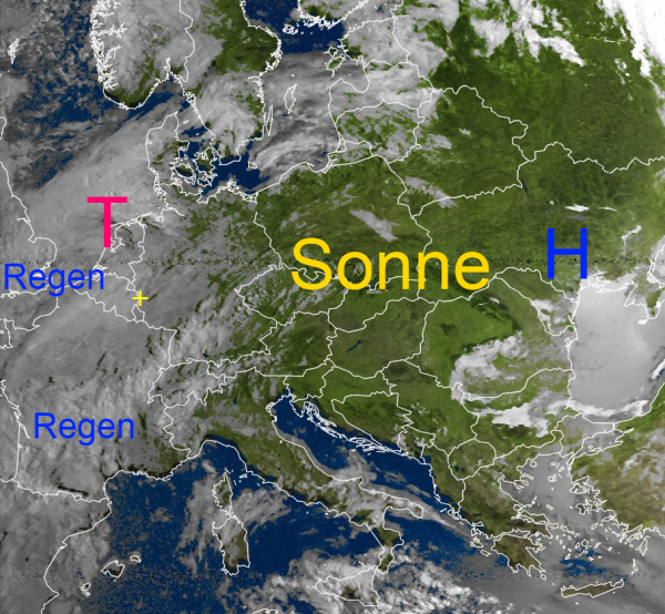 Über Westeuropa und Frankreich halten sich wegen des Tiefs über der südlichen Nordsee viele Wolken. Gebietsweise fällt auch Regen. Diese Wolken kommen auch nach Deutschland voran und sorgen im Nordwesten, sowie im Tagesverlauf an Saar und Oberrhein gelegentlich für nass von oben.