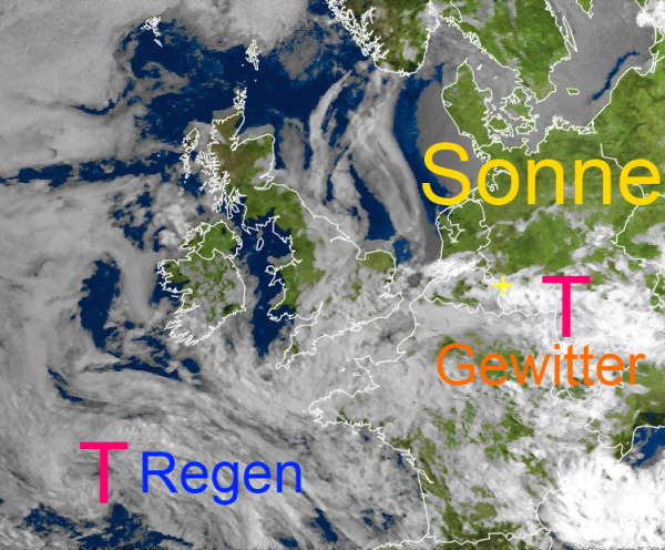 Im Norden und Nordosten unseres Landes behält die Sonne noch die Vormachtstellung. Im übrigen Bereich entstehen in der schwülen Luft immer mehr dunkle Schauer und Gewitterwolken mit Gefahr von örtlichen Unwettern.