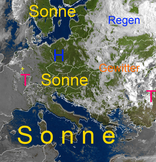 Über weiten Teilen Mitteleuropas herrschen haben Sonne und Hitze die Macht. Die örtlich mächtigeren Quellwolken können Schauer und Gewitter produzieren. Über Osteuropa und im Bereich des Schwarzen Meeres treten Gewitterschauer häufiger auf. Dichtere Wolken sorgen über Nordwestrussland gebietsweise für Regen. Hier ist es mit Temperaturen um die 20 Grad auch kühler.