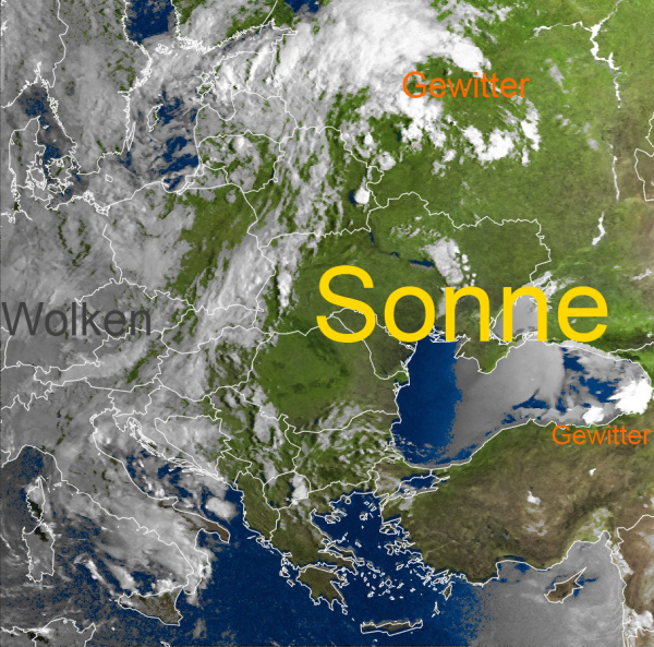 Während sich über Mitteleuropa hartnäckigere Wolken halten, welche die Temperaturen etwas eindämmen, strahlt rund ums Schwarze Meer verbreitet die Sommersonne. Dazu herrscht hier auch Hitze von verbreitet deutlich über 30 Grad. Die helleren Cluster deuten auf einige teils kräftige Schauer- und Gewitterzellen.