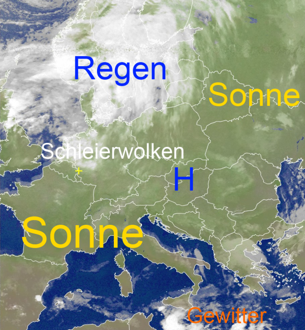 Das Hoch bei Ungarn beschert großen Teilen des Kontinentes einen freundlichen Tag mit reichlich Sonnenschein. Die hohen weißen Schleierwolken über Mitteleuropa schirmen die Intensität der Sonne jedoch ab und lassen sie zeitweise milchig erscheinen.