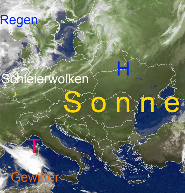 Während teilweise dichtere Schleierwolken über Mitteleuropa hinwegziehen und die Sonne zeitweise milchig abschirmen, strahlt sie über großen Gebieten Ost- und Südeuropas nahezu ungehindert von einem blauen Himmel.