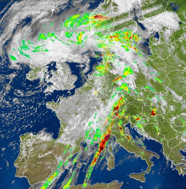 Das Satellitenfoto von heute Nachmittag zeigt die verbreitet dichten Wolken der Ausläufer eines Tiefs über den Britischen Inseln. Über den Britischen Inseln, Frankreich, Benelux, Deutschland und dem südlichen Skandinavien herrscht dazu sehr unbeständiges Wetter mit meist vielen Wolken und zum Teil kräftigen Schauern und auch Gewittern.