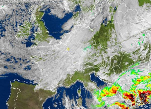 Auf dem Satellitenbild von heute Nachmittag sind weite Teile Europas von dichten Wolken überzogen. Dabei fällt von West- bis nach Mitteleuropa hinein jedoch meist nur leichter Regen. Dagegen sorgt ein kräftiges Tief über der Ägäis mit seinen Ausläufern für verbreitet wechselhaftes und von zahlreichen Schauern und einzelnen Gewittern durchsetztes Wetter. Vielerorts kommt es zu kräftigen und ergiebigen Niederschlägen, teils sind sogar Sturmböen und Hagel möglich.