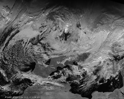 Auf dem heutigen Satellitenfoto sind vor allem über dem Norden und OSten Europas verbreitet dichte Wolken zu erkennen, hierbei fällt im Norden überwiegend Schnee, im Osten vor allem Richtung Schwarzes Meer meist Regen. Sonst entwickeln auch im Mittelmeerraum gebietsweise Schauer und einzelne Gewitter. Freundlich und meist trocken ist es von der Iberischen Halbinsel nach Frankreich und zu den Alpen.