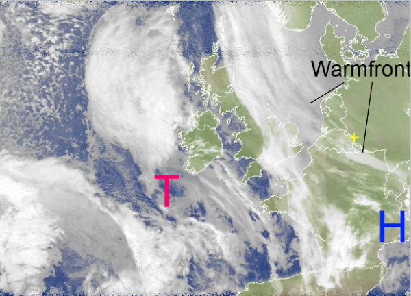 Über den Benelux-Staaten und Nordostfrankreich hat sich eine Warmfront formiert, welche gegen Abend den Westen Deutschlands erreicht und für leichten Regen oder Sprühregen sorgen kann.