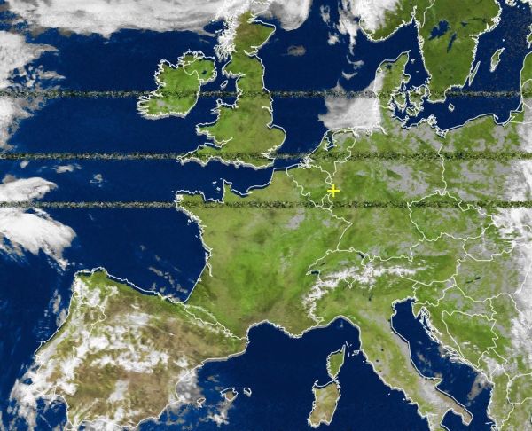 Die Satellitenbildaufnahme von heute Nachmittag zeigt weite Flächen des europäischen Kontinents wolkenfrei oder bei nur geringer Bewölkung. Einige Wolken haben sich über der Iberischen Halbinsel gebildet, diese bringen jedoch keinen Regen. Auch im Nordseeumfeld zeigt sich ein dichtes Wolkenband, dabei bleibt es jedoch ebenfalls trocken.