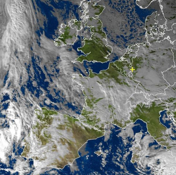 Das Satellitenbild von heute Nachmittag zeigt oft vielen Wolken von West- bis nach Mitteleuropa, jedoch bleibt es bei überwiegend leichtem Hochdruckwetter größtenteils trocken. Sehr freundlich und sonnig ist es derweil im südlichen England, sowie im Norden von Frankreich oder auch über der Nordhälfte von Italien.