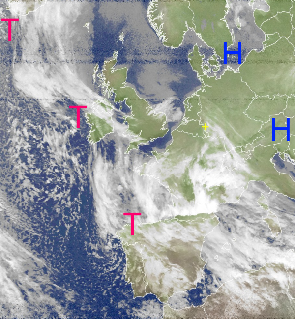 Bei den Wolken über Südwesteuropa handelt es sich meist um hohe und mittelhohe Schichtwolken, die nur selten Regen im Gepäck haben. Atlantische Störungsausläufer haben es nach wie vor schwer sich gegen die trockene und kalte Luft über Mitteleuropa durchzusetzen.