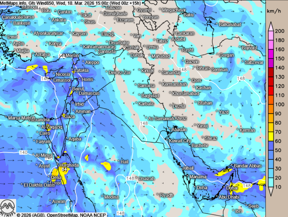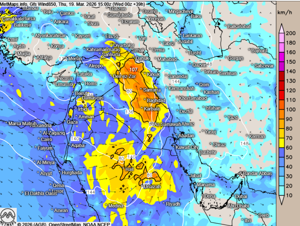 Durch das Sturmtief, das morgen über Syrien und die Türkei zieht, können jedoch Partikel im Nahen Osten verstärkt abregnen – insbesondere über dem Irak und Iran, teilweise auch über der Türkei und Syrien. Die Wetterlage ist von Sturmböen und starkem Regen geprägt.