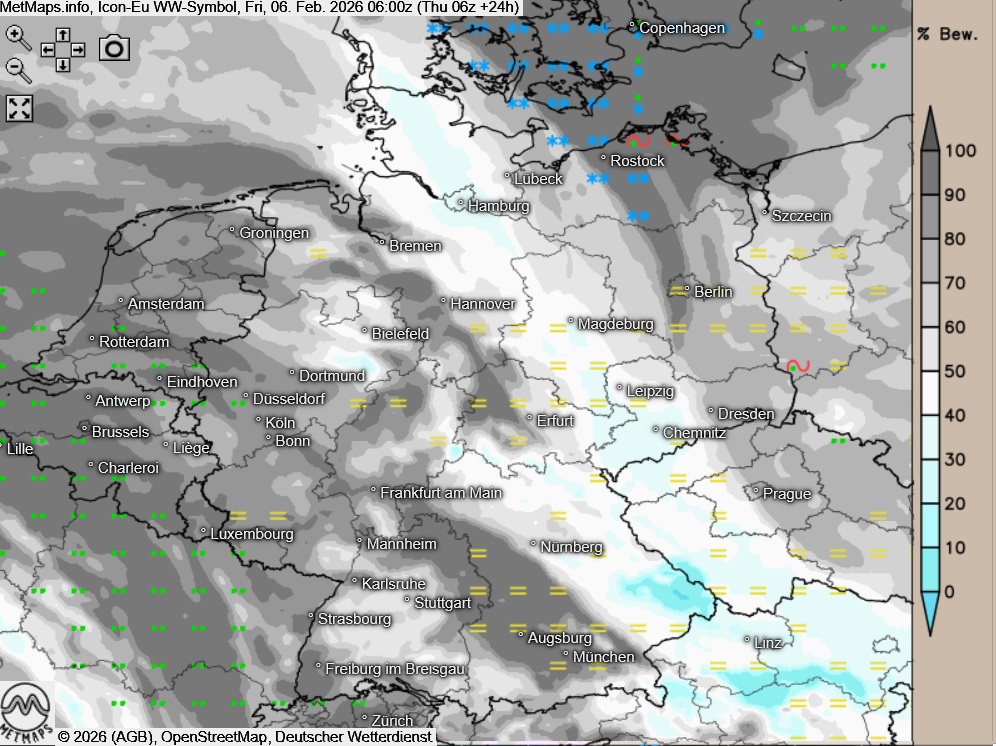 Die Wetterkarte für Freitagmorgen sowie die Sechs-Stunden-Niederschläge / Niederschlagstyp / Temperaturkarte für 06:00 Uhr nach ICON:
