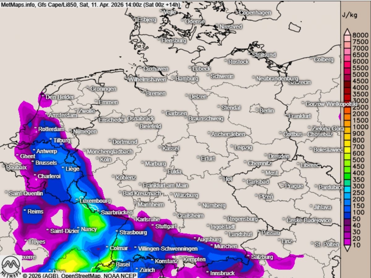 Für Euch hier die Cape-Lifted-Index-Karten für den Nachmittag und die Front nach Wettersymbolen (GFS). Allzu heftig wird das bei diesen geringen Cape-Werten nicht, aber ein Anfang ist gemacht.
