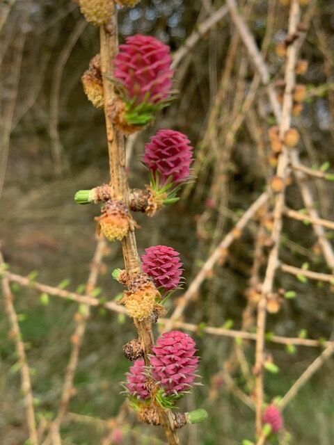 Im phänologischen Garten am Weißen Stein in der Eifel blüht die Europäische Lärche aktuell mit ihren weiblichen Blüten.