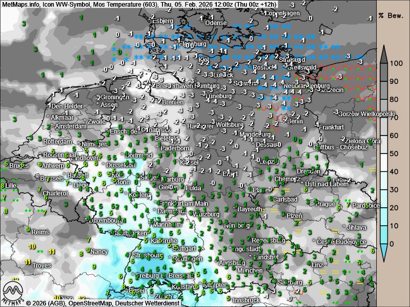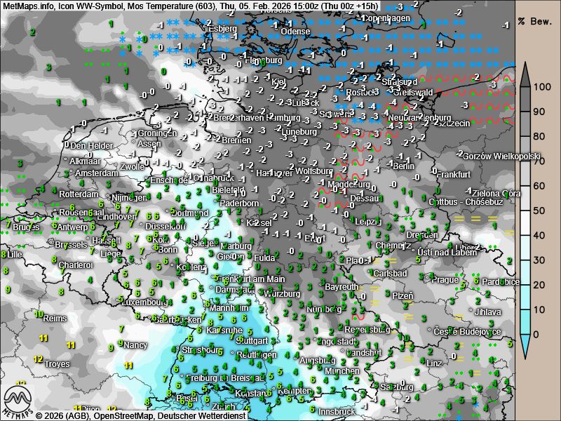 Nach aktuellen Modellberechnungen von ICON setzt sich diese Wetterlage im Tagesverlauf fort. Bis zum Nachmittag ist in den genannten Regionen weiterhin mit winterlichen Niederschlägen und teils erheblicher Glätte zu rechnen.