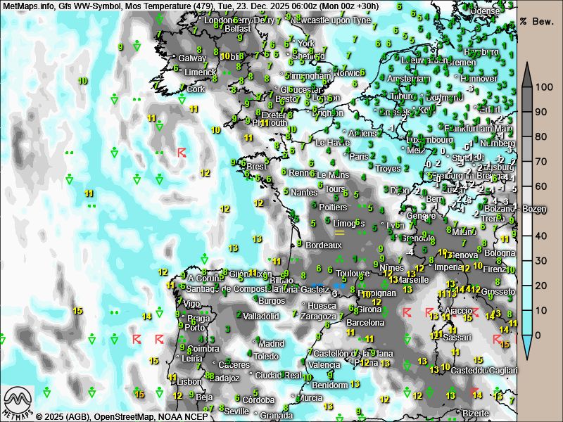 Zur Einordnung die GFS-Prognosen für den westlichen Mittelmeerraum - inklusive der erwarteten Niederschlagsmengen bis Dienstag sowie der Wetterlage am Dienstagmorgen.