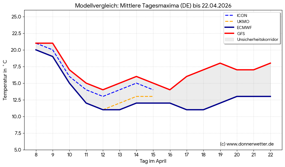 Mehrere Wettermodelle sind sich relativ einig: In den nächsten Tagen wird es deutlich kälter. Das amerikanische GFS ist noch etwas optimistischer, das europäische ECMWF rechnet mit den niedrigsten Temperaturen. Die Tendenz ist aber bei allen ähnlich...