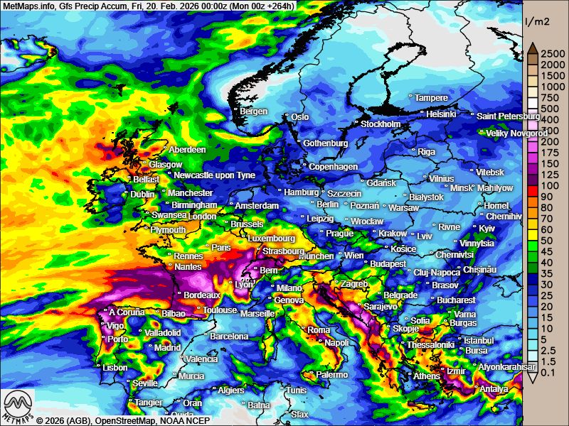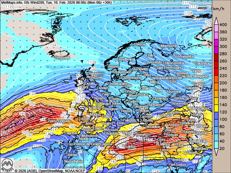 Die akkumulierten Niederschlagsmengen Europa bis zum 20.02.2026, die 200-hPa-Höhenwindkarte für den 10.02. sowie die Wetterkarte für den 11.02. nach GFS: