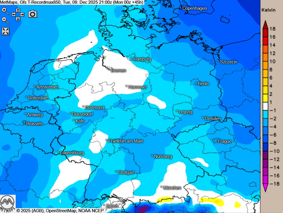Nach aktuellem Stand bleibt die Wetterlage bis kurz vor Weihnachten weitgehend unverändert. Die Modelle zeigen anhaltende Westströmungen bis etwa zum 20. bis 22. Dezember. Zwar gehen die Werte bis dahin auch wieder etwas zurück, eine realistische Chance auf winterliche Verhältnisse gibt es aber allenfalls für die Höhenlagen der Mittelgebirge.
