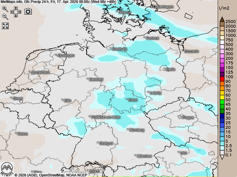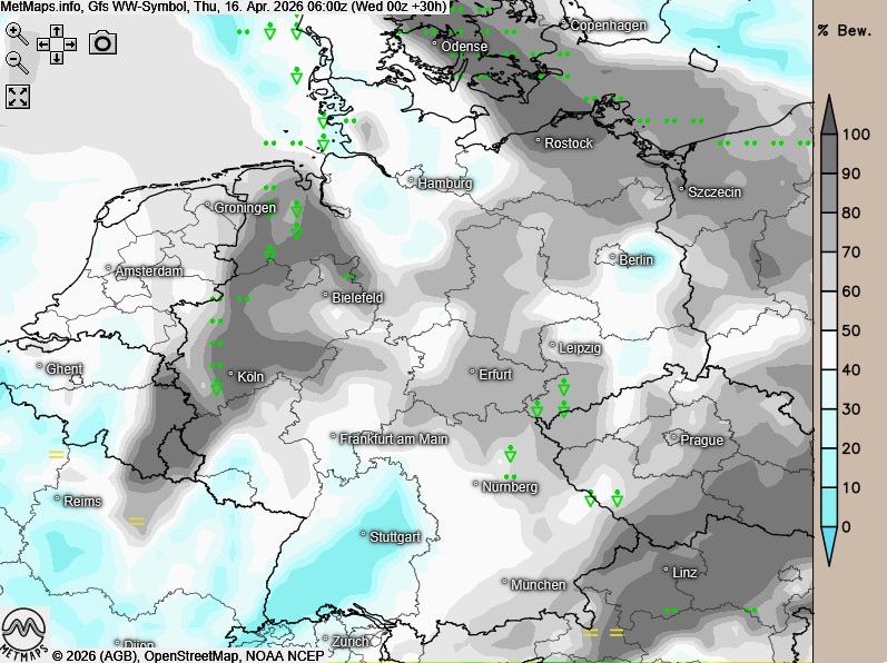 Die Wetter- und Temperaturkarte für Donnerstagfrüh (06:00 Uhr) sowie die 24-Stunden-Regenmengen für Donnerstag nach GFS:
