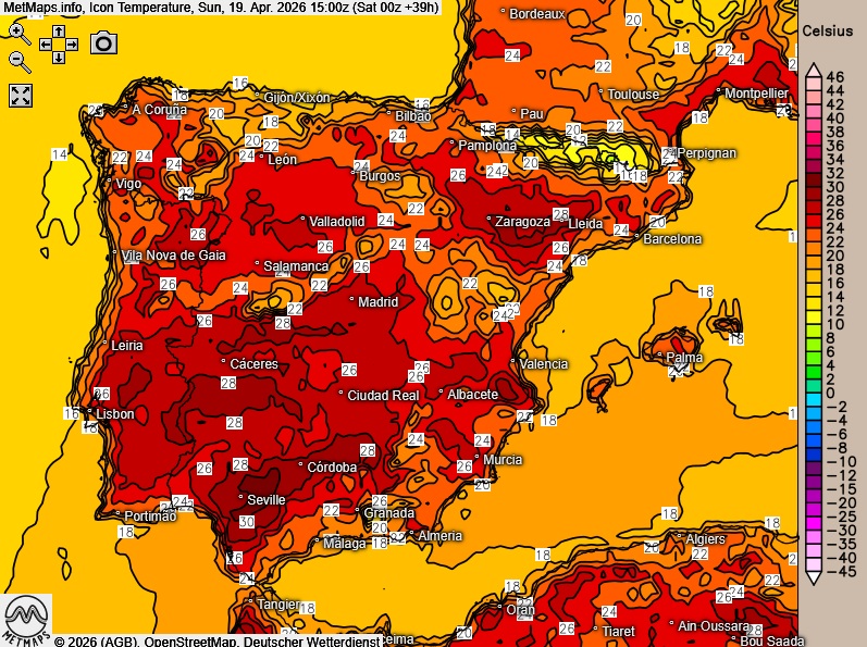 Auch zu Beginn der kommenden Woche bleibt es in Teilen Spaniens sehr heiß. Vor allem im Süden des Landes – etwa rund um die Metropolen Sevilla und Córdoba – sind am Dienstag sogar Spitzenwerte um 32 Grad möglich.