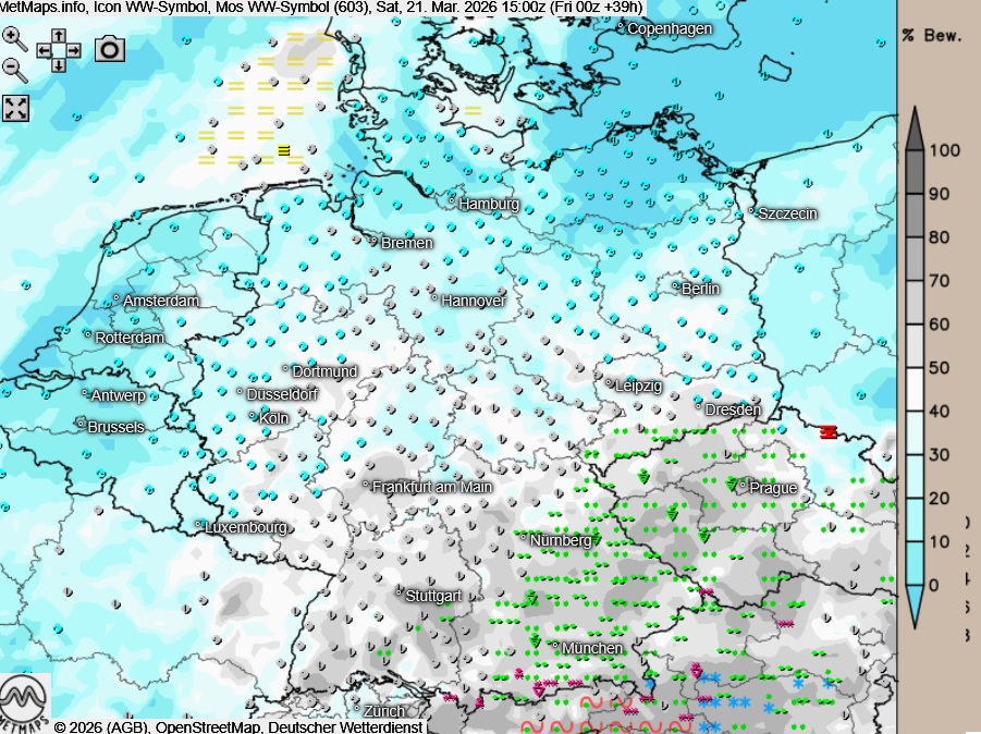 Ein Kaltlufttropfen verpasst den Lufttemperaturen am Nachmittag vor allem im Südosten Deutschlands einen deutlichen Dämpfer: Gebietsweise ist es hier bei dichten Wolken und etwas Regen sechs Grad kälter als noch am Freitag.
