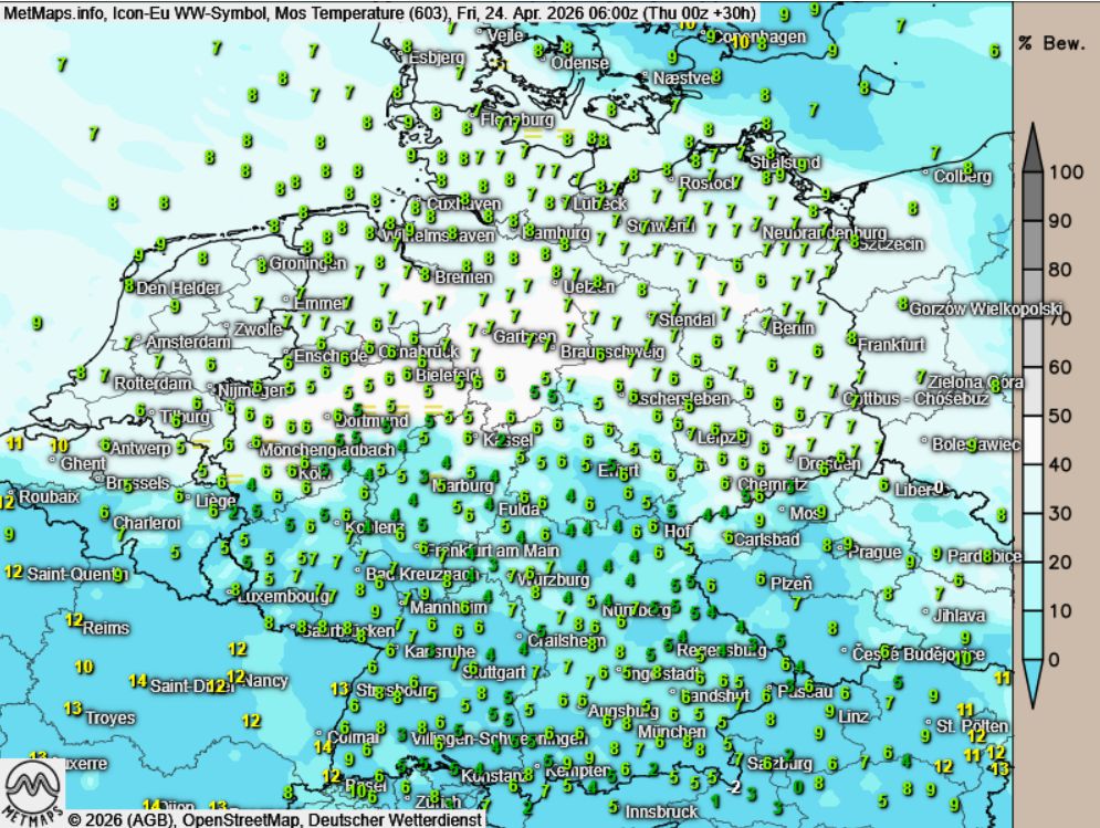 Wetter- / Temperaturkarte Freitagfrüh (06:00 Uhr) Uhr nach Icon-Eu