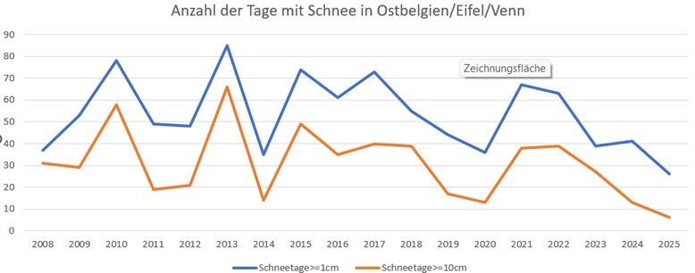 Entwicklung Anzahl Schneetage >=1cm und >=10 cm Ostbelgien/Eifel/Venn seit 2008