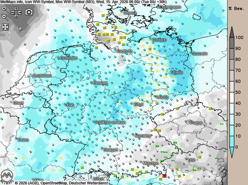 Am Mittwoch zeigt sich der Himmel über dem Süden und Südosten wolkig, es bleibt aber meist trocken. In den übrigen Landesteilen verläuft der Tag heiter oder es ist sonnig.