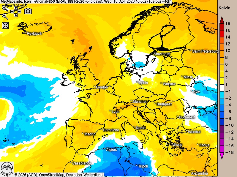 Die Wetterkarte für 06:00 Uhr, sowie die Temperaturen und Temperaturanomalie um 15:00 Uhr nach ICON: